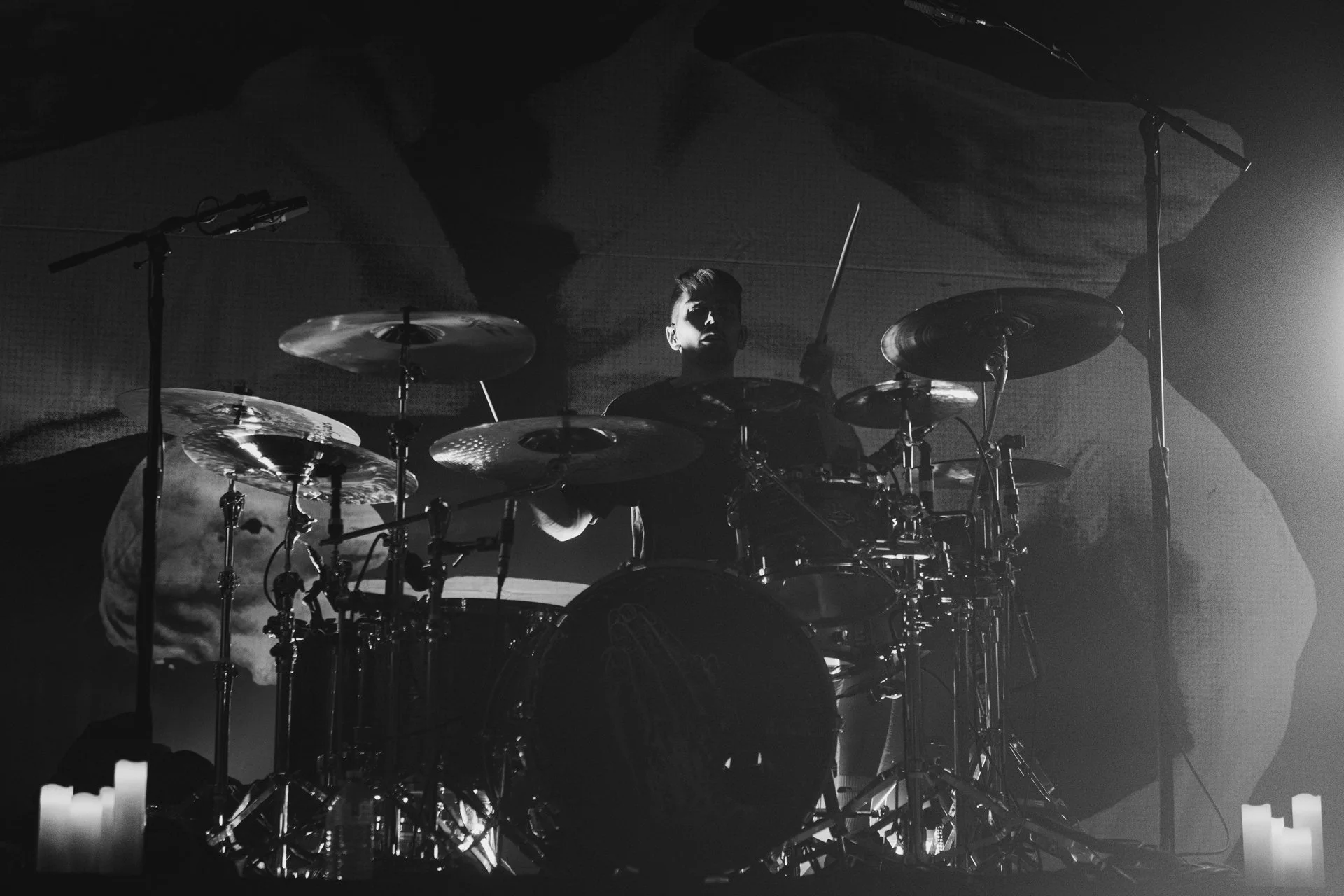 From the moment they stepped on stage, draped in shadows and backlit by bursts of blue, red, and orange strobes, it was clear they weren’t here to ease into the setlist. Church pews lined each side of the stage, towering candelabras flickered, and massive stained-glass-style panels cast a haunting glow—every detail reinforcing the religious imagery of their latest EP. But theatrics aside, it was the music that did the preaching.